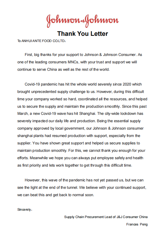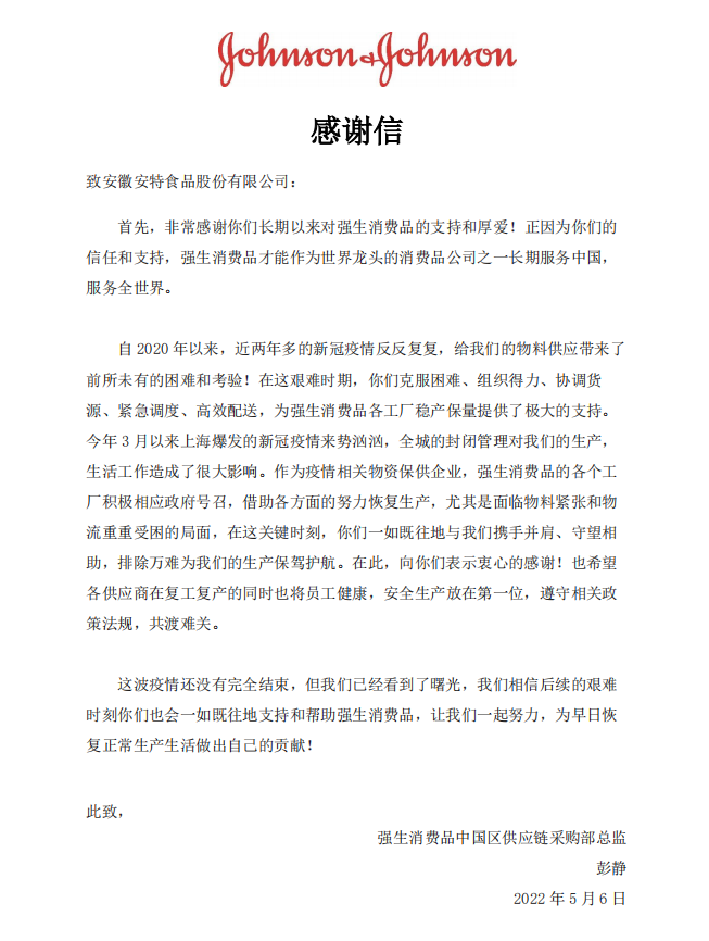 一封來自強(qiáng)生的感謝信